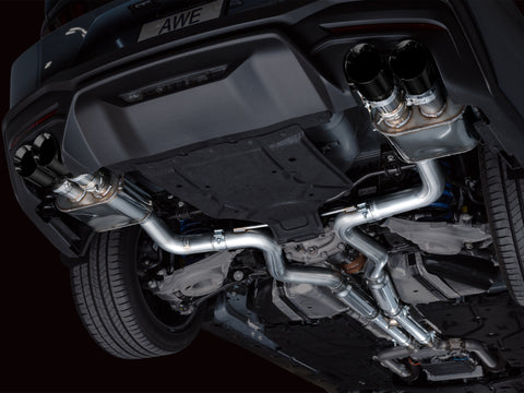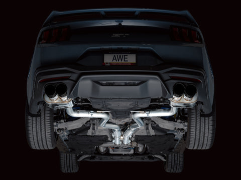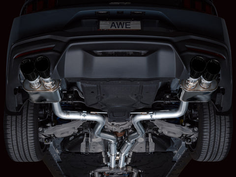 Introducing the AWE SwitchPath™ Cat Back Exhaust for the Ford S650 Mustang GT. This system maintains all the customization options of the factory active exhaust while liberating the Dark Horse’s 5.0L engine with just a button press or a throttle punch. Engineered to blend sophistication with raw power, SwitchPath™ ensures your comfort with its valved design. Featuring a complete 3” build with modular inlets, it includes slip fit adapters for seamless integration with factory headers, and offers a dual 3” connection option for those seeking a more aggressive setup. With tier-1 valving, drive modes, customized settings, and programmable buttons, it swiftly responds to your commands. The precision H-pipe delivers a deep, rich muscle tone with minimal rasp, distinguishing it from X-pipe alternatives. Additionally, straight-through bullet-style resonators in the mid pipes further diminish rasp, particularly beneficial for drivers contemplating header upgrades. On the performance front, it offers dyno-verified gains of +8 hp and +8 lb-ft of torque at the wheels. AWE's SwitchPath™ Cat Back is fully emission-friendly, integrating seamlessly with factory emissions equipment. The package is completed with quad 4” slash-cut, double-walled tips, available in chrome silver or diamond black. Crafted in PA, USA, from US-sourced .065”-wall T304L stainless steel, every aspect is meticulously engineered, designed, and manufactured in-house at AWE. Backed by AWE's Lifetime Warranty, No CEL Light Guarantee, and Perfect Fitment Guarantee.