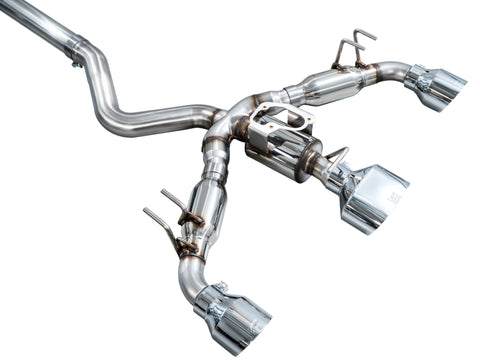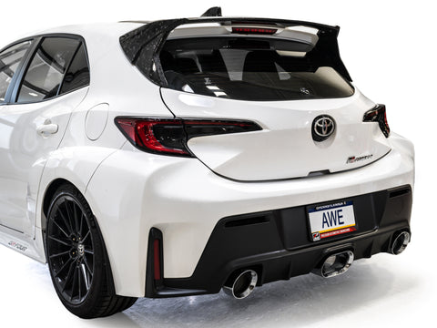 For those who like their volume like their speed (and want to feel the raw nature of the GRC’s potent 3-cylinder at all speeds) the Track Edition features a non-resonated mid-section (i.e. no 180 Technology®). It’s even louder (in & out) than the Touring Edition, while shaving weight and cost. This version is known to get rowdy in mid-range acceleration/deceleration and cruising, and may be too much for some. For this reason, the Track Edition cannot be returned for sound reasons--you've been warned! The Track Edition boasts a 3” T304L stainless steel downpipe-back configuration that brings out an incredibly rowdy and powerful soundtrack that is nothing short of attention-grabbing. AWE designed three, perfectly fitting (and larger) tips for the GRC: one bespoke 4.5" x 8" oval (double-walled, slash-cut tip and stamped with the AWE logo) in the center, and two 5” double-walled, slash-cut tips left and right. No forced block-off plates or quad setups here - just pure GR look, as intended. When it comes to valves, the rumors are true - they don't matter once you remove the backpressure issues of the stock configuration (and you can't open the valve yourself anyway). So we decided to delete them, save weight, drop price, and make the best sounding exhaust available for the GRC. And in case you're wondering, there's a tailored mount right on the exhaust so you have a solid location to bolt up your factory valve after removing the unnecessary organ. All this supported by AWE’s Perfect Fitment Guarantee, No CEL Guarantee, and Lifetime Warranty.