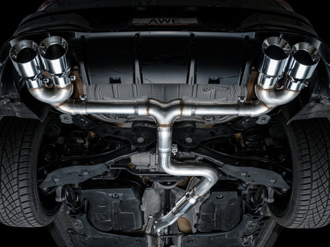 The Track Edition features a 3” inlet complete with an adapter to accommodate the factory downpipe perfectly while leaving an open 3” connection. Featuring minimal filter with one bullet resonator in the center, the Track Edition provides a full-bodied soundtrack at all times.. This configuration provides the best ratio of interior refinement and exterior rumble on the market. No valves needed. Switch driving modes and the exhaust will render the same result as a vavled exhaust. It's the do-it-all exhaust for every day drivers. Comes complete with quad 4.5" slash-cut, double-walled tips in chrome silver.