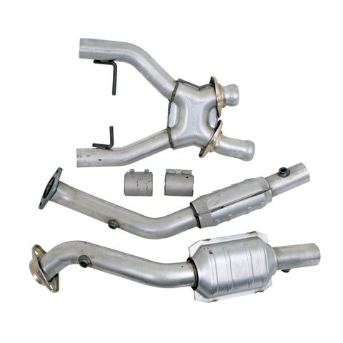 BBK High Flow performance X pipes are designed to maximize the horsepower and torque of your 1996-1998 Ford Mustang Cobra 4.6L 4V. Every BBK Performancec X pipe is designed as a direct replacement for the factory pipe and features larger diameter 16 gauge 2-1/2 in. CNC mandrel bent amuminized steel tubing with a unique BBK center X section for improved exhaust extraction, along with high flow catalytic converters to help increase exhaust flow and maximize performance to the rear wheels. These BBK full catted X pipes will install directly to the factory exhaust headers or any aftermarket shorty exhaust and feature factory O2 sensor placement for simple direct installation. A BBK catted X pipe is the best way to really improve your Mustangs exhaust flow over the restrictive factory pipe to increase overall performance, plus it will sound great with an additional V8 muscle car growl. Please Note. This BBK product is not legal for use in some states including California: Please check your local emission laws and requirements.