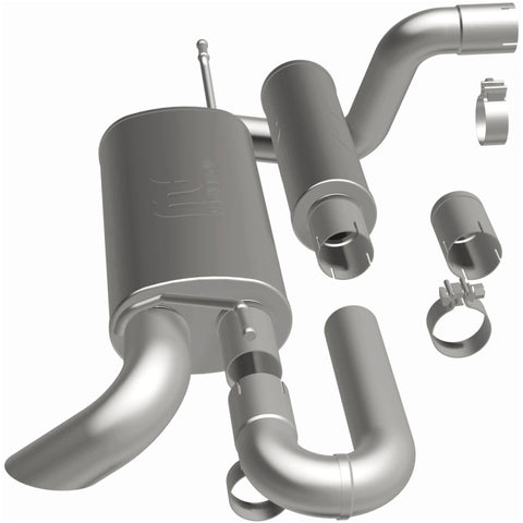 The MagnaFlow Jeep Wrangler Overland Series Axle-Back Performance Exhaust System #19620 brings additional off-roading prowess, dyno-proven performance and a tunable exhaust sound to your 2018-2024 Jeep Wrangler JL equipped with the 2.0L or 3.6L engine option. The high clearance design of this exhaust system is designed to keep clear of any challenging terrain you may come across. #19620’s 2.5” diameter mandrel bent main piping passes through an 18” straight-through oval muffler and NDT (No Drone Technology) tuned chamber before terminating in a high-clearance tucked tailpipe to the rear of the passenger side. No Drone Technology utilizes passive quarter-wave noise cancellation to minimize the unwanted droning noises that can otherwise occur at highway cruising speeds. The entire kit can be tailored to your preferred exhaust tone by changing out which module is attached to the integrated muffler’s accessory port. The included pipe cap, J-pipe and NDT modules can be combined in various ways to mitigate a wide range of droning frequencies, so which sound profile you choose to go with is up to you. Because the integrated overland muffler incorporates NDT technology to begin with, all configurations offer various forms of NDT benefits. Looking to minimize overall drone? Simply connect the NDT module. Prefer a more traditional rendition of that famous MagnaFlow exhaust tone? All you need to do is cover the accessory port with the included pipe cap. Exhaust kit #19620 utilizes a direct-fit, easy to install design that replaces your OEM exhaust system from near the rear axle on back. This Jeep Wrangler performance exhaust system is made of durable, corrosion resistant stainless steel and produced using advanced CNC precision robotic manufacturing techniques, all backed by MagnaFlow’s limited lifetime warranty.