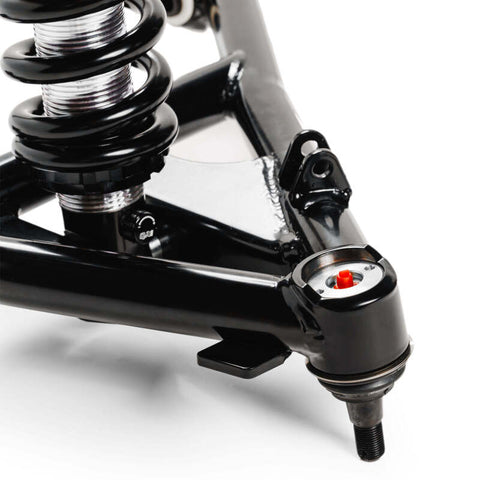 Product Overview Upgrade the front suspension of your NBS truck with QA1’s complete coil-over and control arm kit. Designed for 2WD 1999–2006 Silverado and Sierra 1500s, this system includes tubular upper and lower control arms and QA1’s single adjustable coil-overs DIAL IN THE PERFECT STANCE QA1’s front coil-overs give you 1" to 3" of ride height adjustability right out of the box. Want to go lower? Pair them with QA1’s 2" drop spindles (Part Number: 9056-120) for a total drop range of 3" to 5" up front. Whether you're aiming for a subtle level or a slammed street look, this setup lets you get it just right. IMPROVED GEOMETRY WITH BOLT-ON CONTROL ARMS The included QA1 upper and lower tubular control arms are built to improve suspension geometry and increase strength over stock. They offer more clearance for coil-overs, reduce deflection under load, and help maintain proper alignment. RIDE QUALITY YOU CAN TUNE This kit features QA1’s single adjustable coil-overs, allowing you to set your preferred ride height and fine-tune damping with 18 clicks of combined compression and rebound adjustment. It’s easy to adjust on the vehicle and delivers a noticeable improvement in both comfort and control. STRAIGHTFORWARD, BOLT-ON INSTALL This system bolts directly into place using standard tools—no welding required. QA1 includes everything you need for a smooth install, with pre-installed ball joints and bushings in both control arms to save you time. MADE IN THE USA QA1 NBS suspension is proudly made in Lakeville, Minnesota and built to last with a durable powder coat finish. Fitment Notes: Fits 1999–2006 Chevrolet Silverado / GMC Sierra 1500 2WD with coil front suspension: Works exclusively with QA1 sway bar (Part Number: 52869) - does not fit with factory sway bar: Works with factory or QA1 drop spindles (Part Number: 9056-120): Not compatible with vehicles originally equipped with torsion bar front suspension