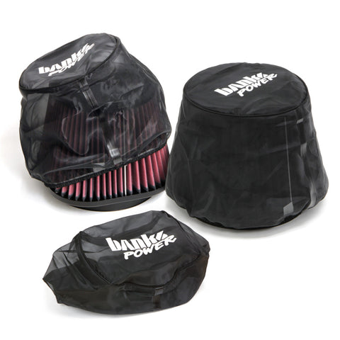 Highly recommended in dirty environments. Keep your Ram-Air Filter protected from large debris, bugs, mud, etc... Built from a breathable material, the Banks Pre-Filter simply goes over your air filter and provides additional protection and can even extend cleaning intervals. Works with both Dry and Oiled filters. Banks pre-filter wraps are designed to work with your Ram-Air intake system and are constructed from a polyester mesh with uniform micron openings. It improves the filtering of larger debris and dirt by preventing them from getting embedded into the filter. This allows your your Banks Ram-Air to breathe easier for longer by increasing the time between services. Its hydrophobic surface has been treated to repel water and improve performance in humid or wet environments. The pre-filter is able to resist heat up to 400 degrees Fahrenheit and will not shatter in freezing temperatures. Key Features: Hydrophobic to repel water and moisture. Prevents large debris clogging filter pleats. Reduces service intervals. Cleanable and reusable. Extends filter life