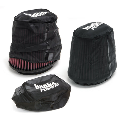Highly recommended in dirty environments. Keep your Ram-Air Filter protected from large debris, bugs, mud, etc... Built from a breathable material, the Banks Pre-Filter goes over your air filter, provides additional protection, and can even extend cleaning intervals. Works with both Dry and Oiled filters Banks pre-filter wraps are designed to work with your Ram-Air intake system and are constructed from a polyester mesh with uniform micron openings. It improves the filtering of larger debris and dirt by preventing them from getting embedded into the filter. This allows your Banks Ram-Air to breathe easier for longer by increasing the time between services. Its hydrophobic surface has been treated to repel water and improve performance in humid or wet environments. The pre-filter is able to resist heat up to 400 degrees Fahrenheit and will not shatter in freezing temperatures. Key Features: Hydrophobic to repel water and moisture. Prevents large debris clogging filter pleats. Reduces service intervals. Cleanable and reusable. Extends filter life